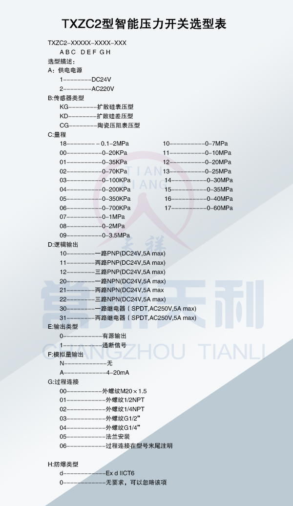今天接著給客戶介紹下常州天利產(chǎn)品TXZC系列智能壓力開關(guān)中的同型號的另一款產(chǎn)品,概述,參數(shù),選型如下。