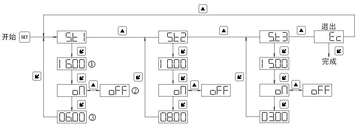 按“Set”鍵3秒,顯示“ST1”,按“▲”鍵,面板循環(huán)顯示:“ST1”“ST2”“ST3”“Ec”。 |